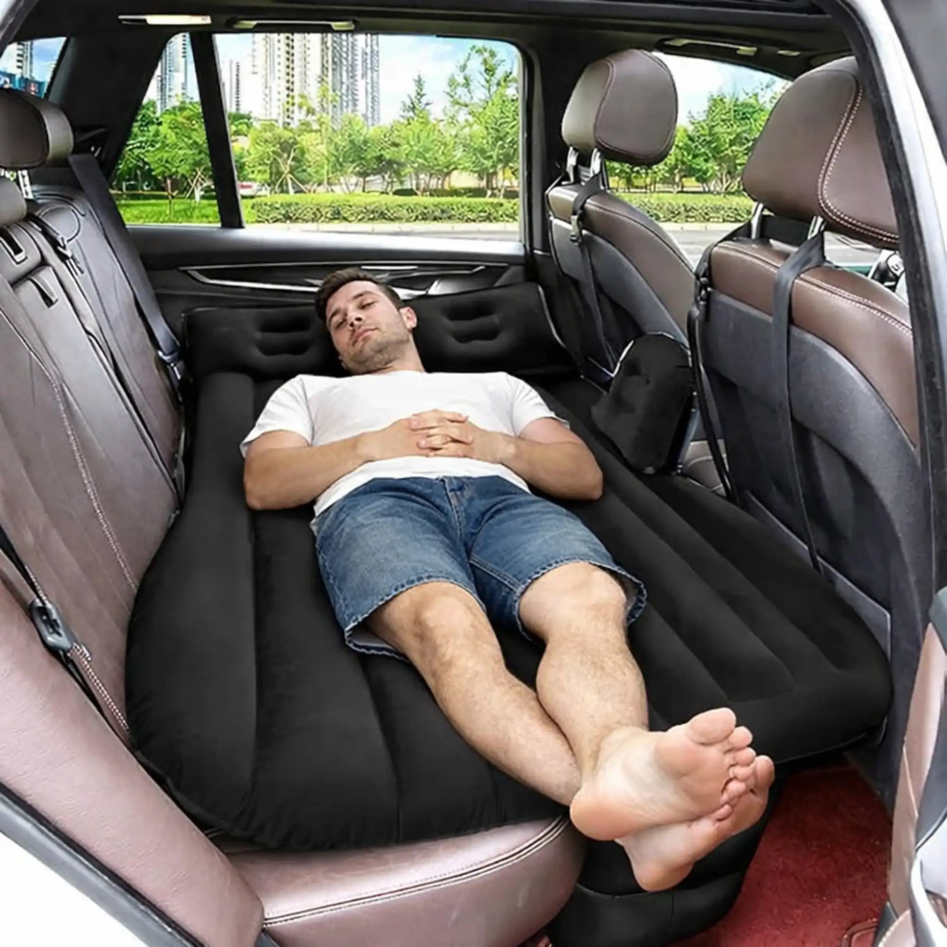Nuestro colchón inflable para carro es fácil de usar, cómodo y se ajusta a cualquier tamaño de vehículo. Ahora podrás disfrutar de tus viajes sin preocuparte por el dolor de cuello y espalda al dormir en asientos incómodos.